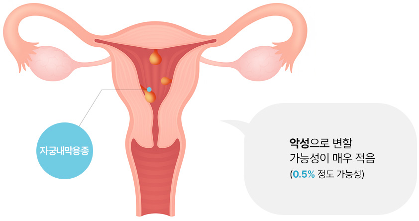 자궁내막용종은 자궁내막 조직이 국소적으로 과도하게 증식하여 돌기 모양의 양성 종양입니다.